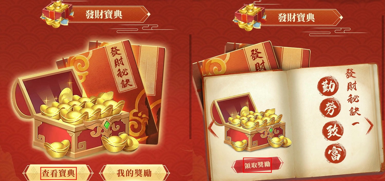 累天登入獎勵,這次比較麻煩,要先點「查看寶典」,再點「領取獎勵」。