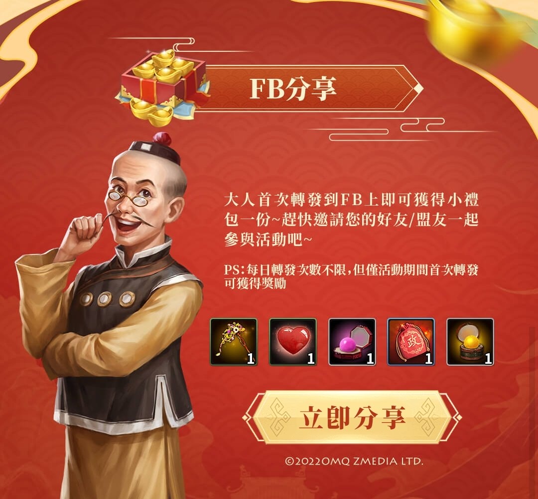 FB分享獎勵,根據以往經驗,每次網頁活動能領取的天數會不一樣,有時是只有第一天分享時能拿,後面幾天分享都沒獎勵,有時到第2~3天重複分享也能拿到獎勵。我每次網頁活動開始時都會找個帳號測試一下,其他小號就按照結果來行動。此次分享獎勵僅第一次能領取。