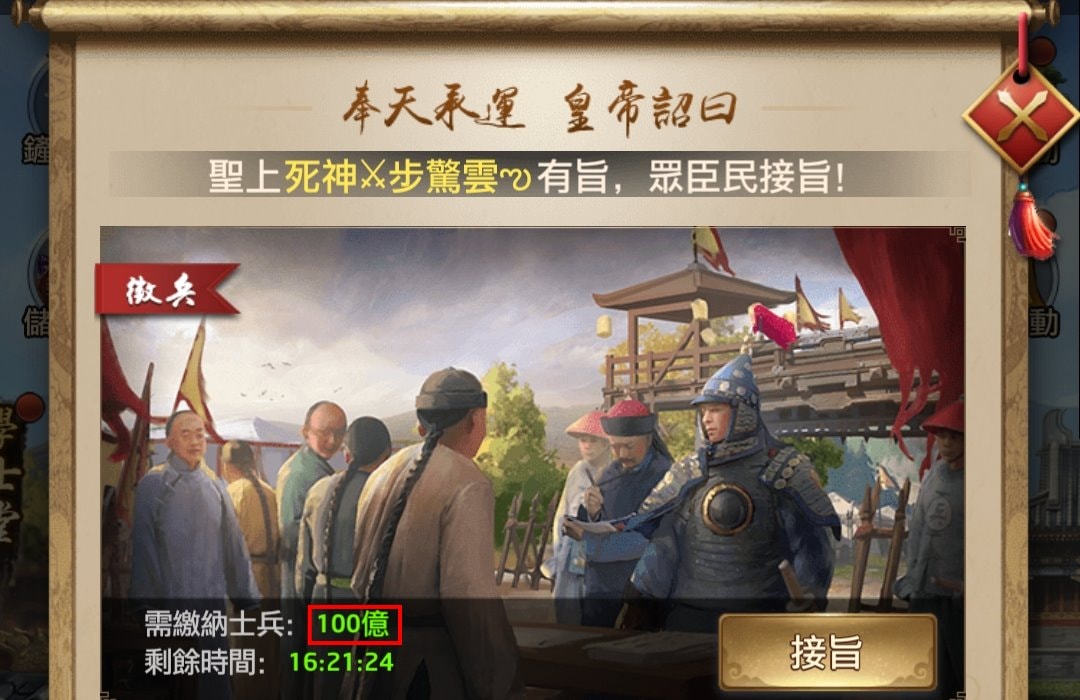 獎勵:政務令*1、屬性丹*1、精力丹(粉紅丹)*1、書籍經驗書*1、技能經驗書*1