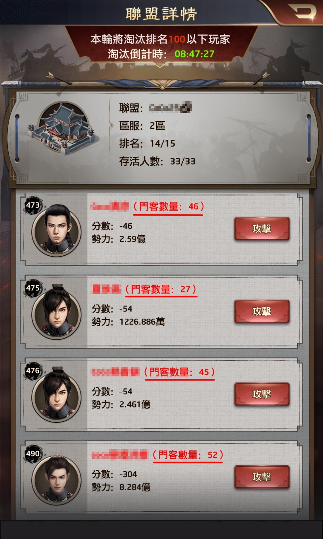 改版後在「衙門絕地賽」中,點擊某個聯盟的城池後的界面,會新增「門客數量」的資訊,界面也有改版過。