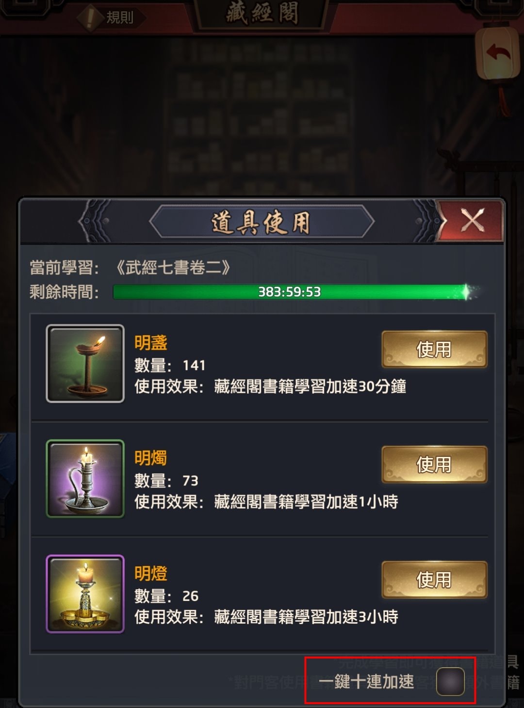 藏經閣的一鍵十連加速,完整官品/VIP/一鍵功能詳見: