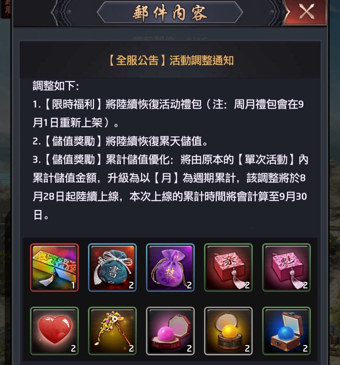 - 限時禮包(俗稱RMB禮包/人民幣禮包)被拿掉了,獎勵說是調整到每日儲值獎勵中,但對小額儲值的玩家來說,每週限購/每月限購中的禮包有些還不錯。