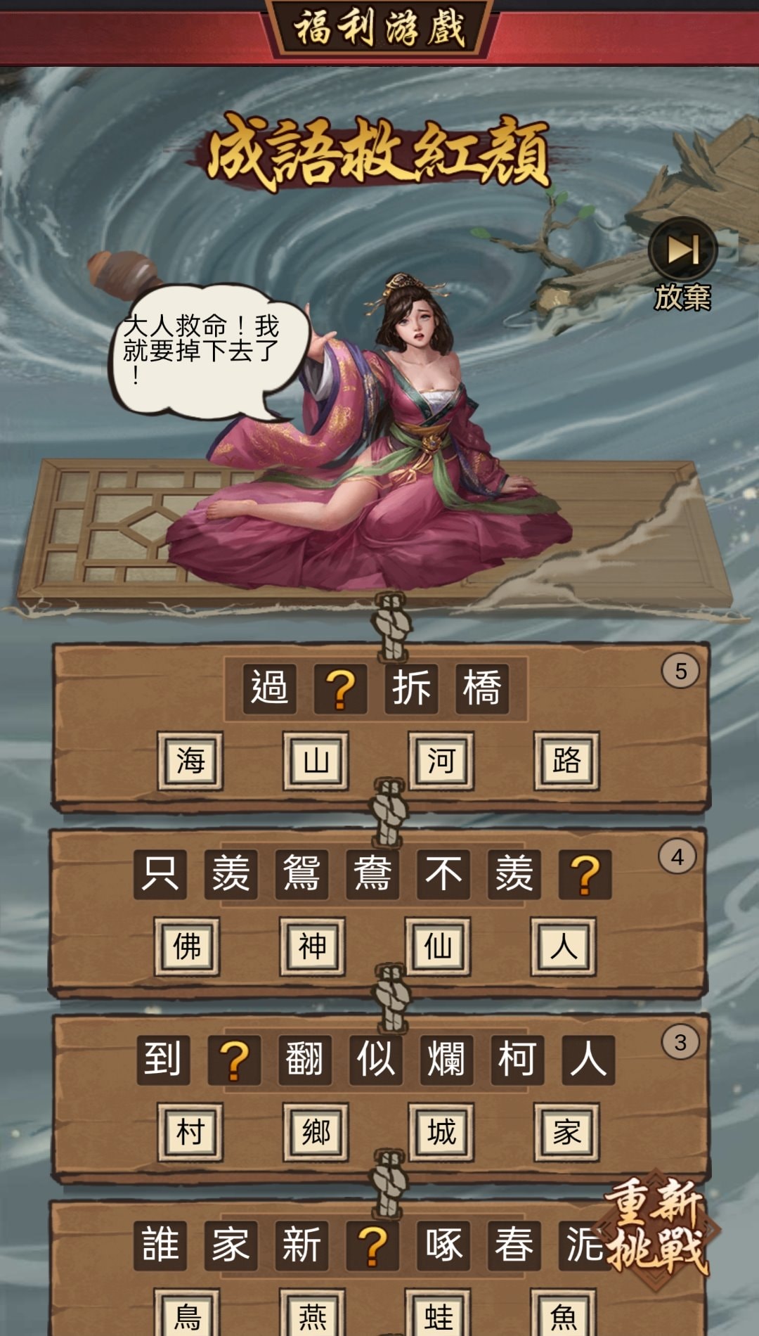 福利遊戲為創號後選一個來玩,目前只有成語就紅顏,填入問號中正確的字即可。詳細介紹: