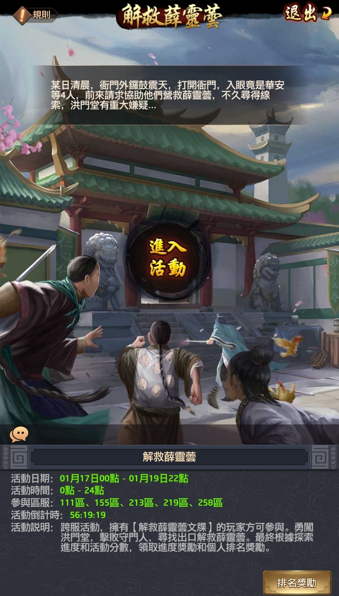 「烏龍院」聯動結束後,以「解救薛靈蕓」取代「解救桃花」,兩者玩法相同,玩法沒重新寫介紹,地圖有換不同方式來呈現,資料則是根據改版內容再發一篇,請參閱: