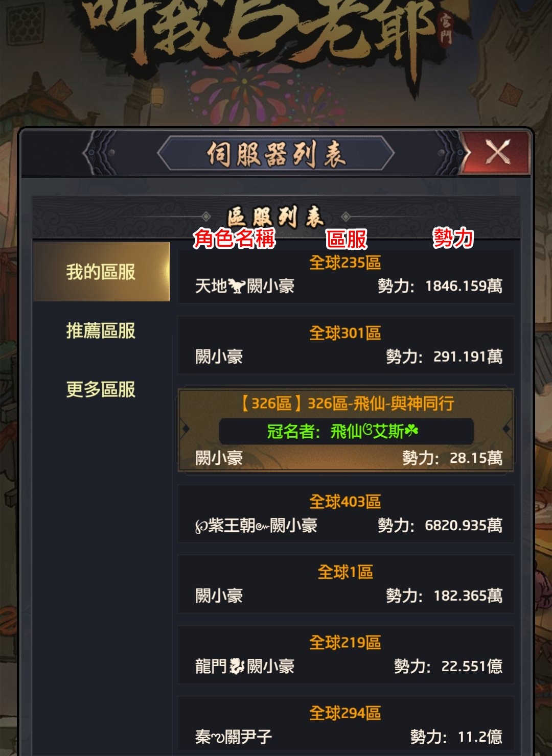 登入畫面「伺服器列表」的「我的區服」這,新增顯示遊戲名稱、勢力兩個資料,對於在多服擁有帳號的玩家來說辨識度提昇許多。