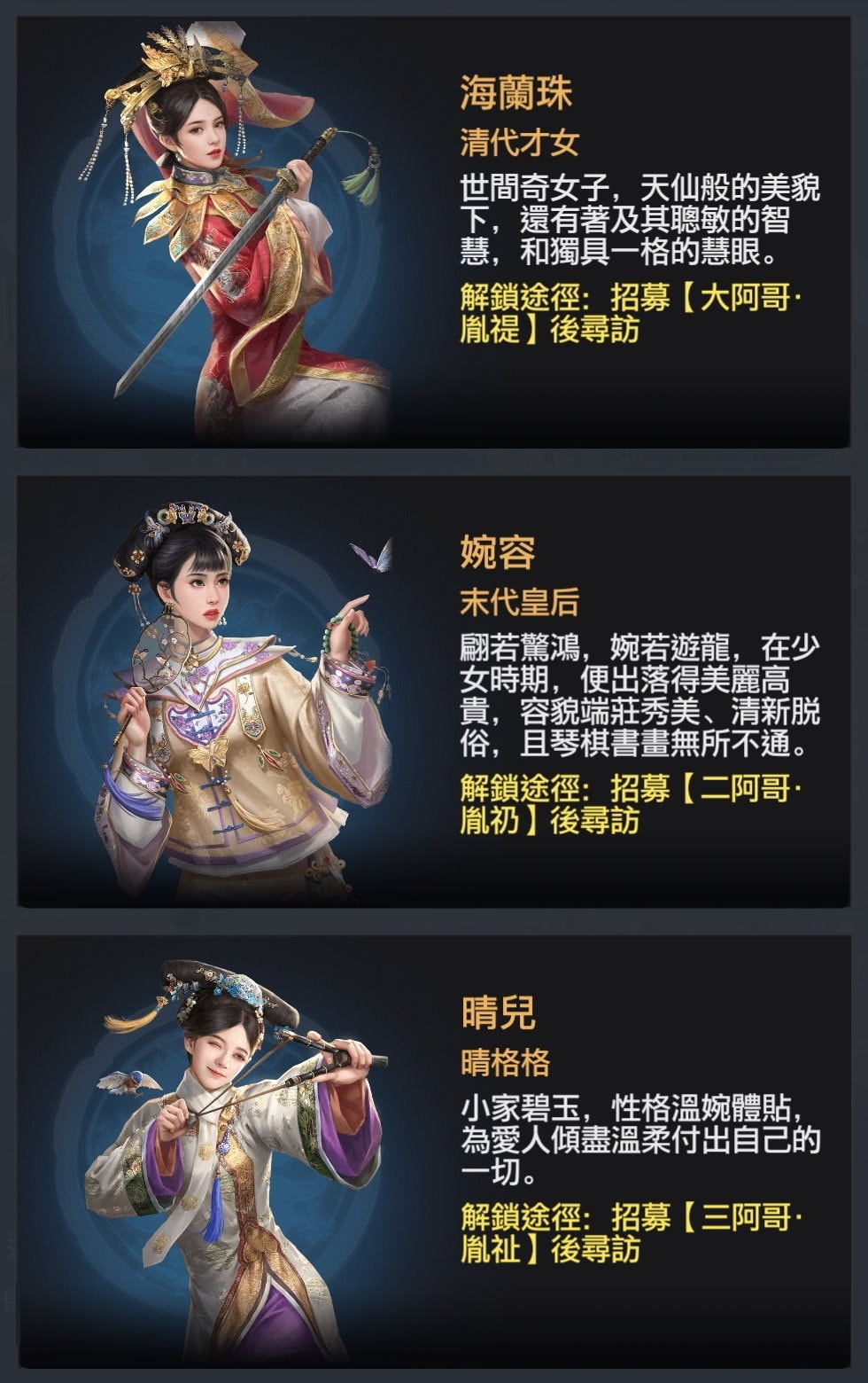 | 晴兒 | 先置條件尋訪 | 取得對應門客(三阿哥)後尋訪 | 1,000 | 三阿哥.胤祉 |