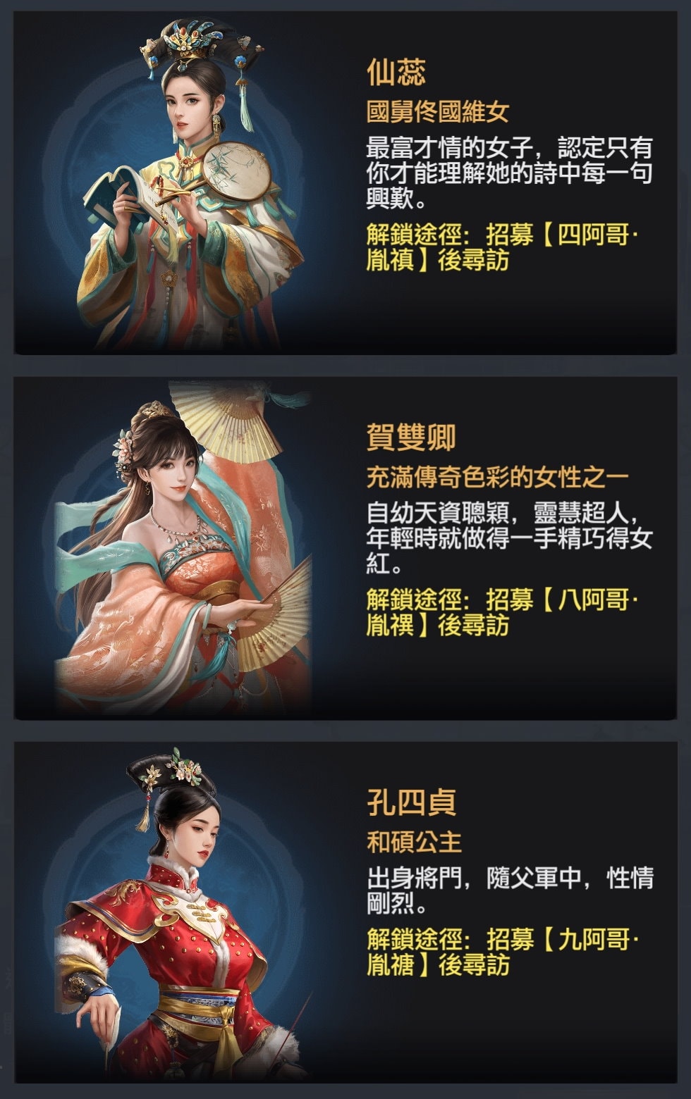 | 賀雙卿 | 先置條件尋訪 | 取得對應門客(八阿哥)後尋訪 | 1,000 | 八阿哥.胤禩 |