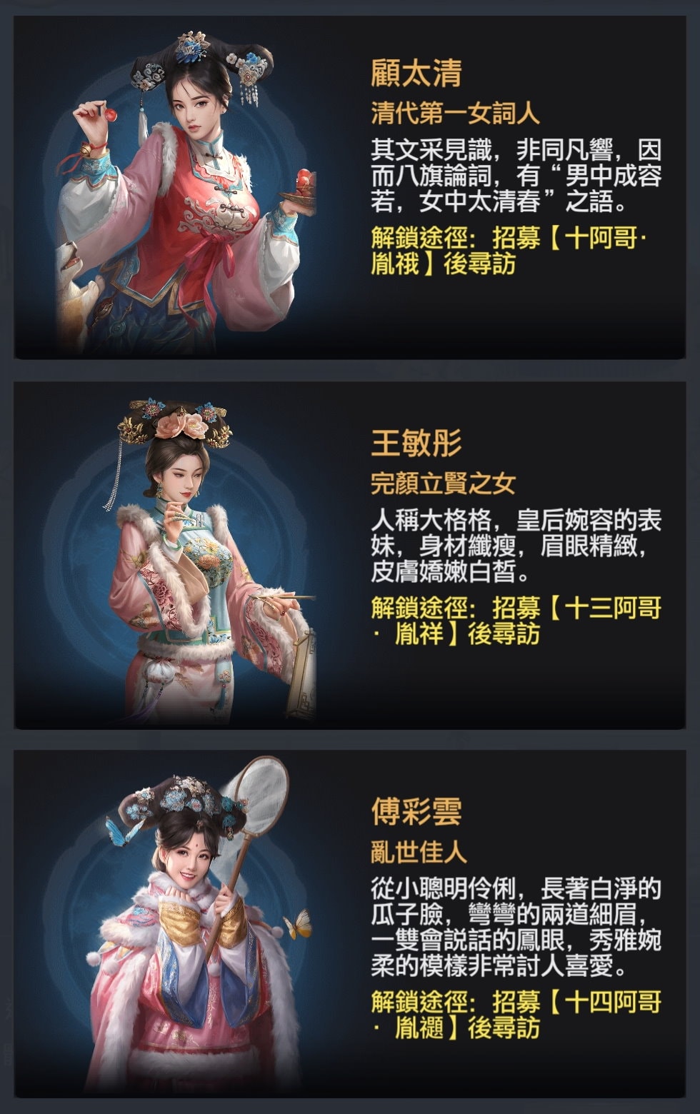 | 顧太清 | 先置條件尋訪 | 取得對應門客(十阿哥)後尋訪 | 1,000 | 十阿哥.胤䄉 |