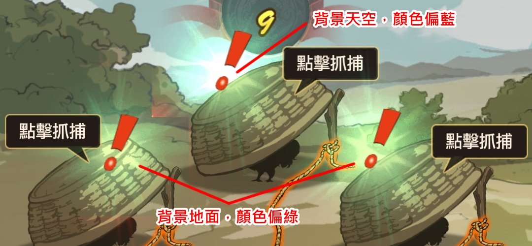 另外注意到,這次「一個驚嘆號」原本是綠色,但改版後可能是背景顏色有差別,導致出現在中間(背景是天空)時顏色會偏淡藍色,出現在左右兩側(背景是地面)時顏色會偏淡綠色,但其實都是同樣的等級。附註:圖片截圖時機沒有抓的很好,沒有很明顯,可進遊戲中觀察。