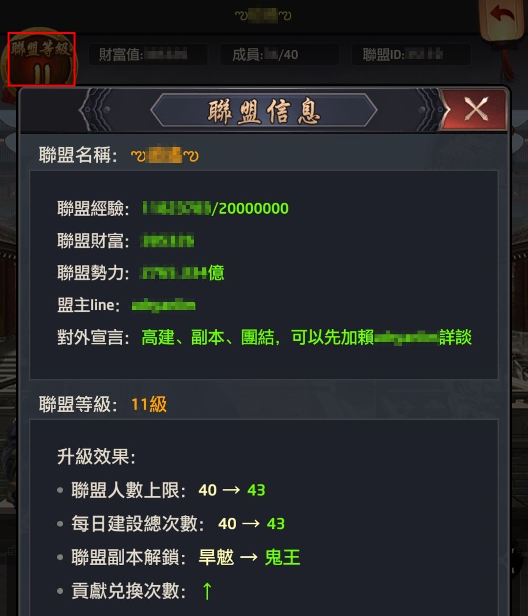 在聯盟介面點擊「聯盟等級」時,可看到聯盟升級後的效果。