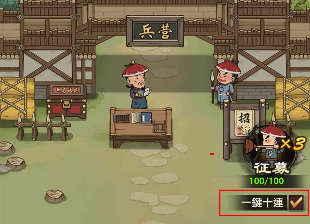 被玩家稱為手指復健的「兵營」,新增「一鍵十連」(徵募)功能,原本每10小時要點100下,現在只要點10下而已喔。