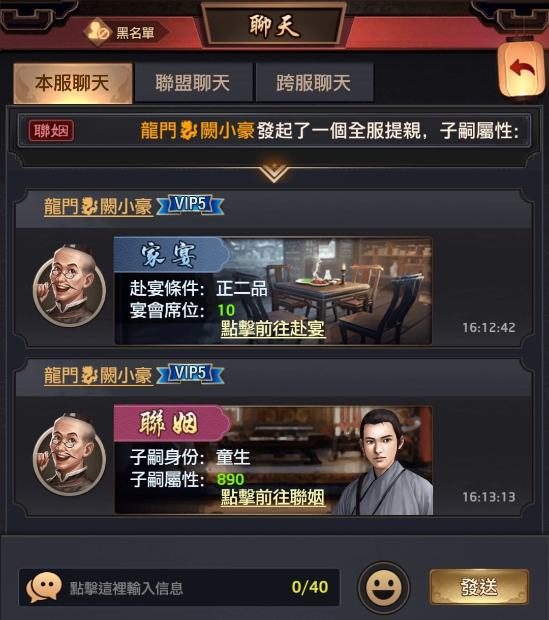 改版後,「聯姻」使用全服招親或是「宴會」開宴,都會自動發通知到「本服聊天」中,點擊後則可直接前往該介面互動。個人是覺得這設計還不錯,方便,畫面也有質感,但也一定會導致公頻真正要對話的內容,會全被這類訊息洗版。就像盟頻出現藏經閣邀請訊息後全是該類訊息。