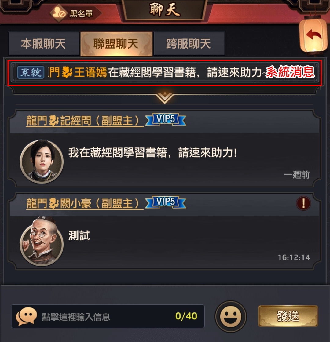 這個我不是很肯定,官方的說明為「聯盟聊天的消息整合進系統消息內」,似乎是指原本系統消息(圖片紅框處)只有在「本服聊天」與「跨服聊天」中,現在「聯盟聊天」也納入。