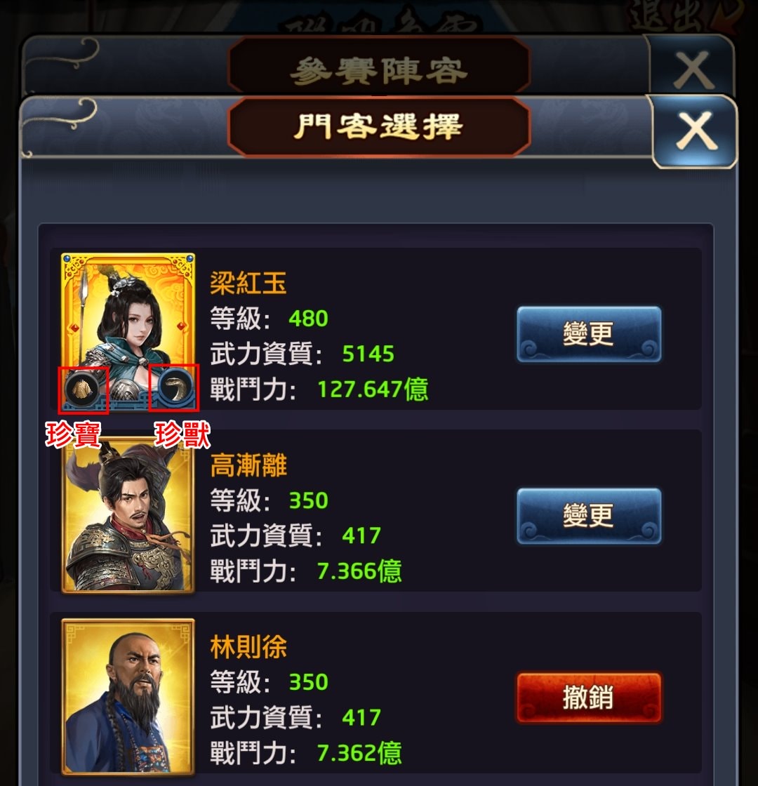 「盟戰」派遣門客時,若有裝備「珍寶」或攜帶「珍獸」都會顯示。