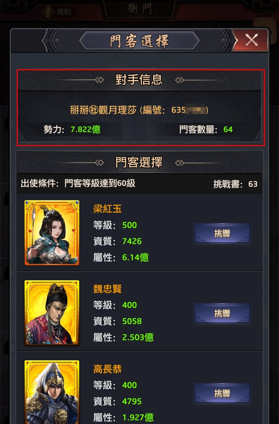 在衙門(與衝榜)挑戰對手時,上方新增「對手信息」,會顯示對手ID、勢力、門客數量,以前使用挑戰書或追捕玩家時不會顯示這個資訊。