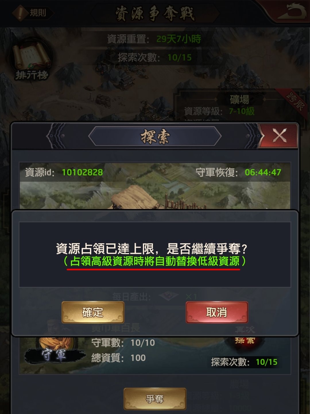 改版後,「資源爭奪戰」搶奪並成功佔領高級資源點時,會自動替換掉低級資源點。改版前則是得手動點進去「資源詳情」(我的資源)先把其中幾個資源點放棄,才能去佔領新的。