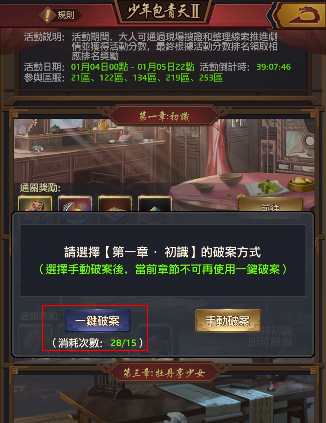 「少年包青天Ⅱ」相當花費時間、給的報酬相當稀少、重複遊玩時毫無樂趣可言,總算新增「一鍵破案」功能,當某章節曾經破案過,之後便可在「一鍵破案」與「手動破案」兩者間做選擇。一鍵破案相關資料我也整理在資料篇中。