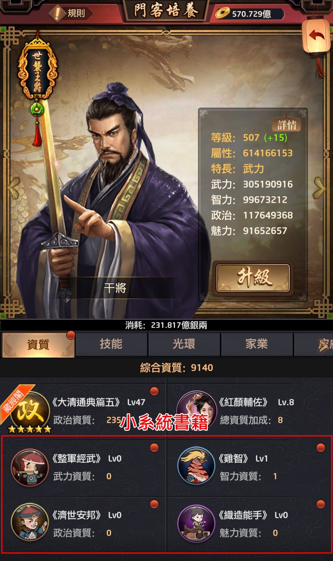 九龍紅顏還有一個設定是:沒有「紅顏技能1~7」,這可以理解成阿哥門客比較像是招募令門客而非紅顏門客。
