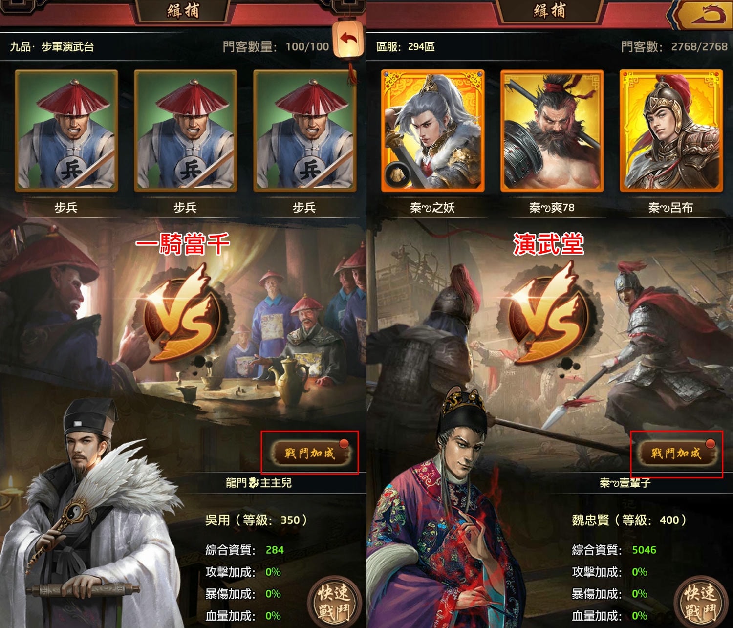 改版前的「演武堂」與「一騎當千」在進入戰鬥的時候會自動跳出「戰鬥加成」,這對一騎當千的影響比較大,一般玩家大多是30出戰來說,通常只有最強的門客需要加成,其餘29出戰都得按掉加成。