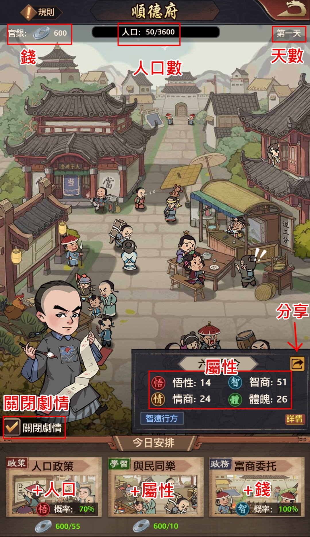 透過上任縣令做出最多100天的決策來影響該縣的人口成長,並用來升級新的政治書籍《濟世安邦》。詳細介紹: