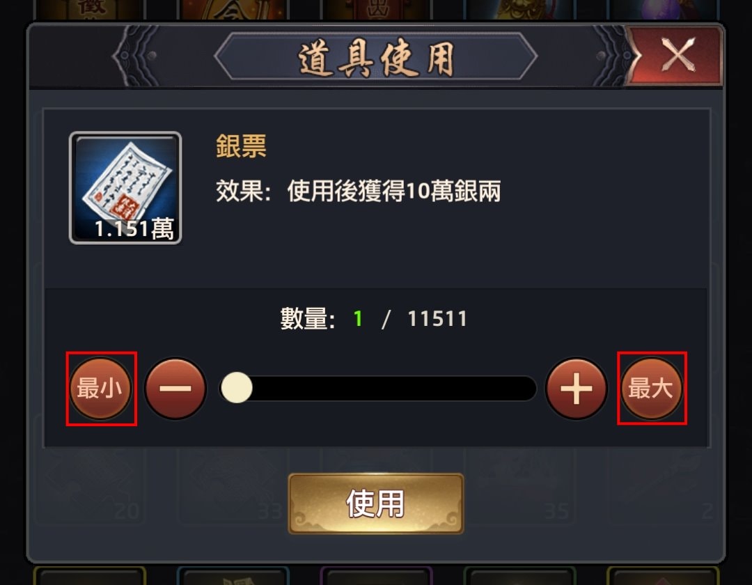 以往使用道具,擁有道具數量龐大時,主要是靠拖曳數量軸來控制比例大概的數量,再使用加號(單擊+1)、減號(單擊-1)來控治準確數量。