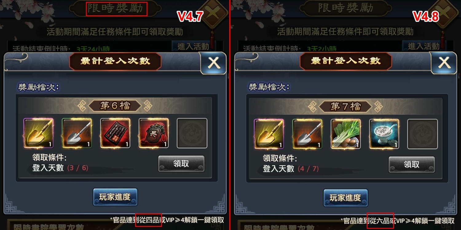 - 限時獎勵:「一鍵領取」功能從四品調整為從六品開放