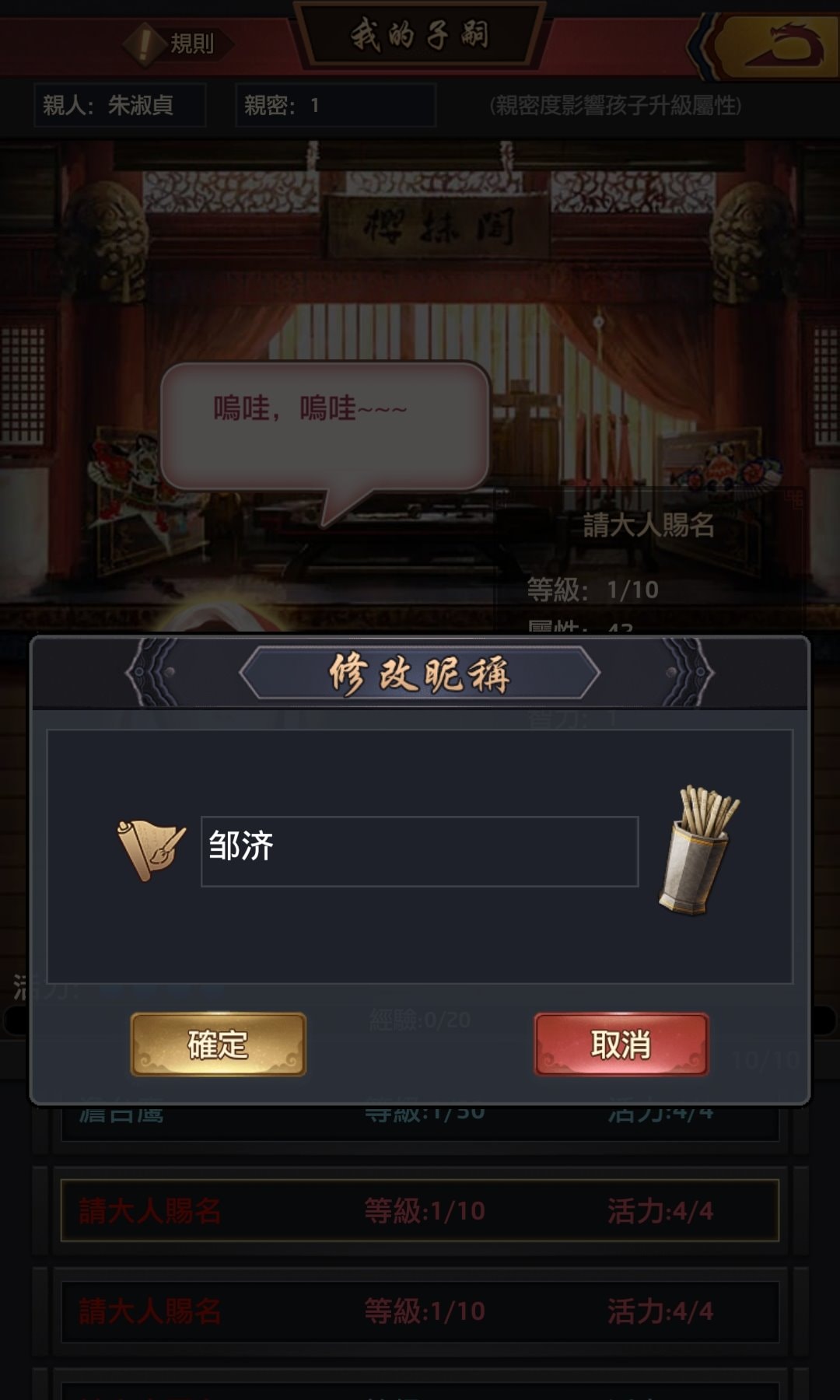 此次改版更新(19日)後,我用一隻已更新到V4.8版的手機登入帳號A,發現培養子嗣界面這,隨機名稱全是簡體字,且85%以上都是2個字的姓名。