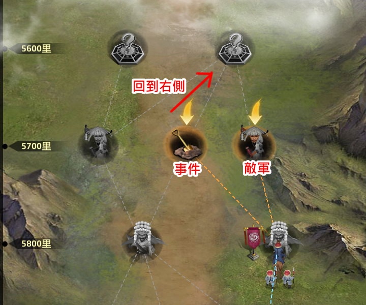 - 如果想降低遇到敵軍的風險,或是想保存戰力打後面一點的敵軍,就繞路。