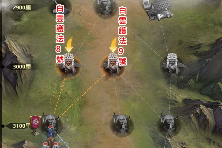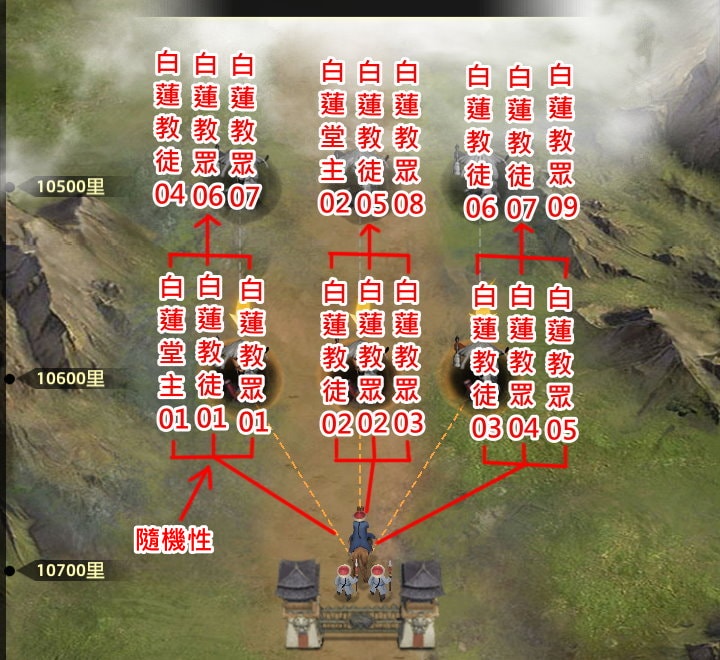 再來就是要考慮到路線問題,若大家是自由前進,以上方的圖來說,在第1個據點(10600里)就得打掉9位白蓮教徒,大家才能一起往前進;但如果大家都選同一條路線,只要打掉3位白蓮教徒,就能讓所有人一起往前進。