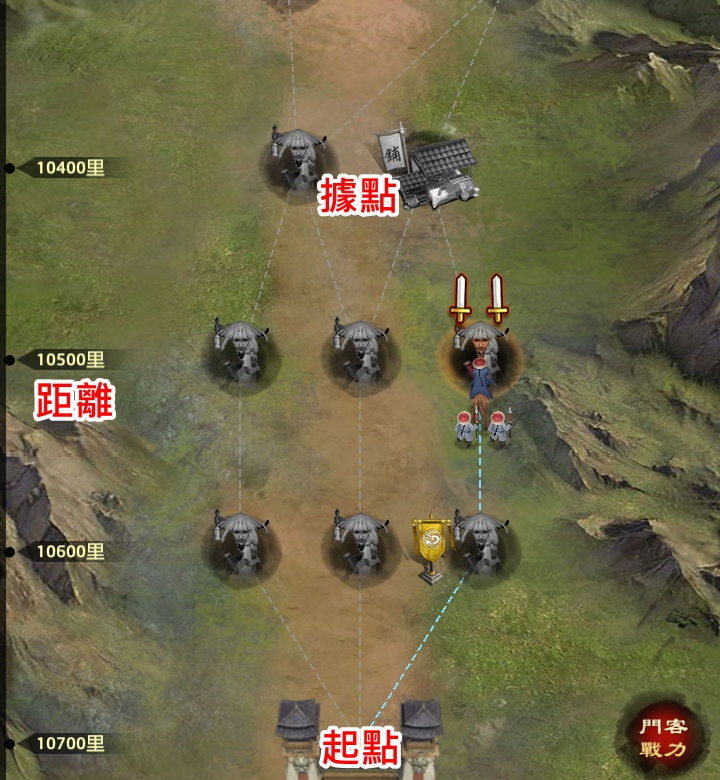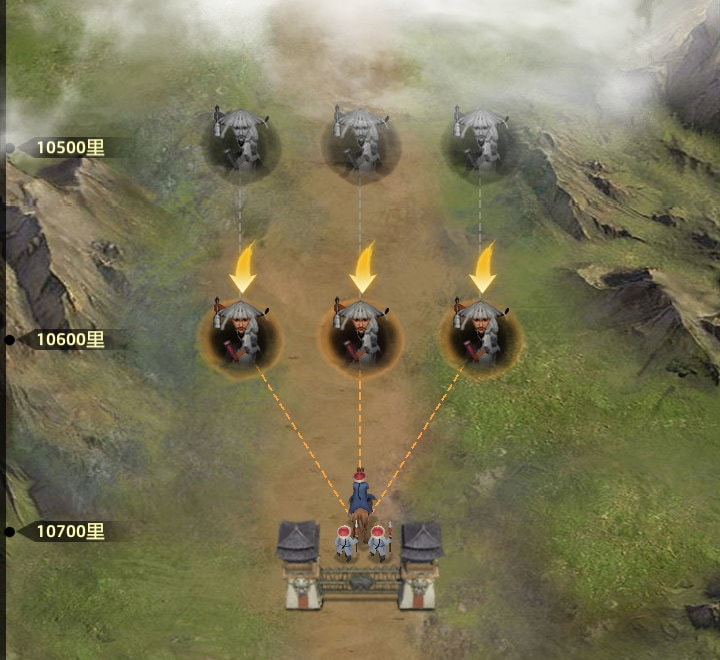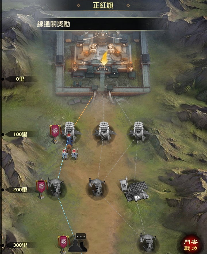 從起點出發時,可以自行選擇要前進的路線,像一開始若是「10700里」,這是指距離BOSS「白蓮教首」的距離,往前一個據點則是前進100里。