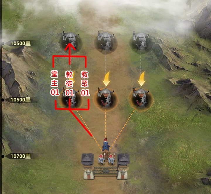 走進一個「小兵據點」,裡頭會有3隻小兵(請見改版說明),隨機組合,有可能是堂主+教徒+教眾,也有可能是堂主+堂主+教徒,或是教徒+教眾+教眾,譬如說是10600里左路的組合是:堂主No.001、教徒No.001、教眾No.001,
