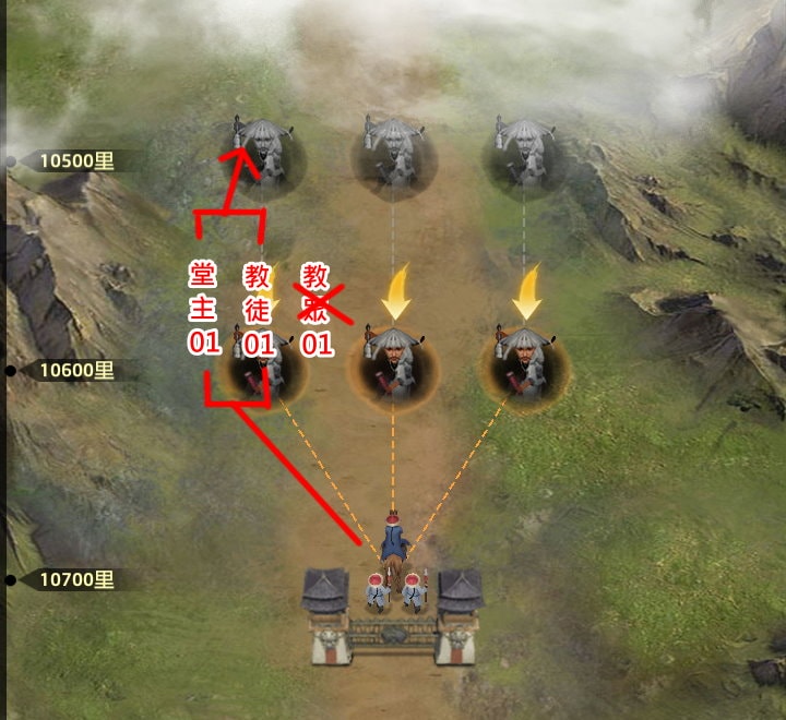 至於11:00點前是隨機到「堂主01」跟「教徒01」這兩條路的,由於「堂主01」跟「教徒01」還沒被打死,仍然會持續卡在10600里左路。