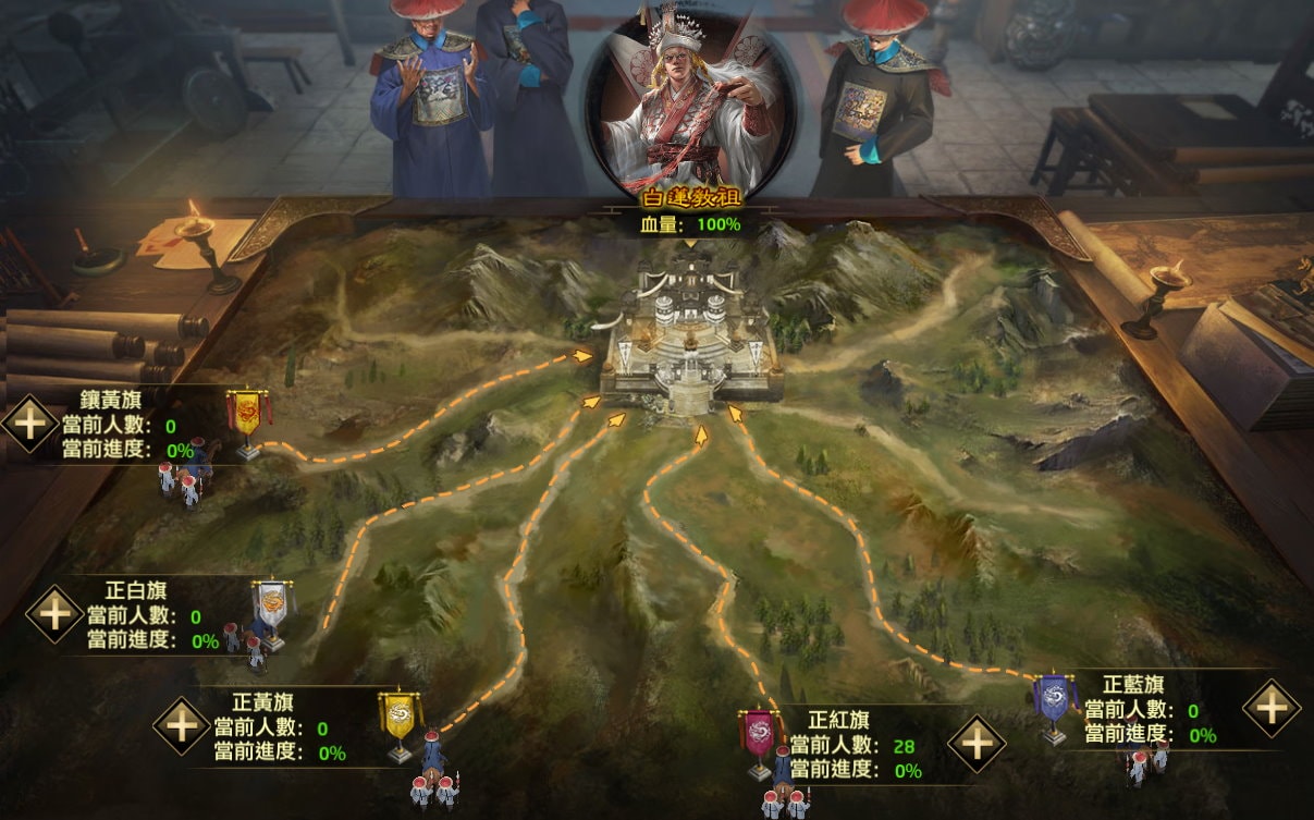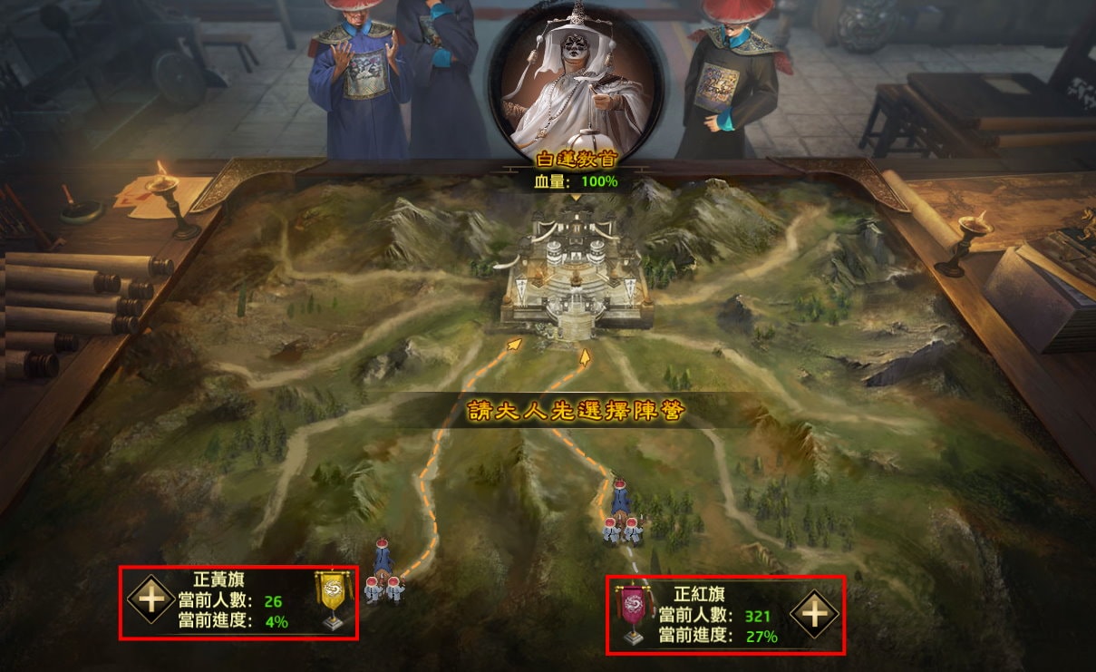像我在A服(開服8個月左右)打白蓮教,正紅旗有321人、正黃旗只有26人,我選正黃旗,第一天晚上9點多才上線打,結果在第1個據點就卡住了。但是選正紅旗的玩家,至少都往前推進20幾次(2000多里)了。如果整服玩家都選同一陣營,就能往前推更長。