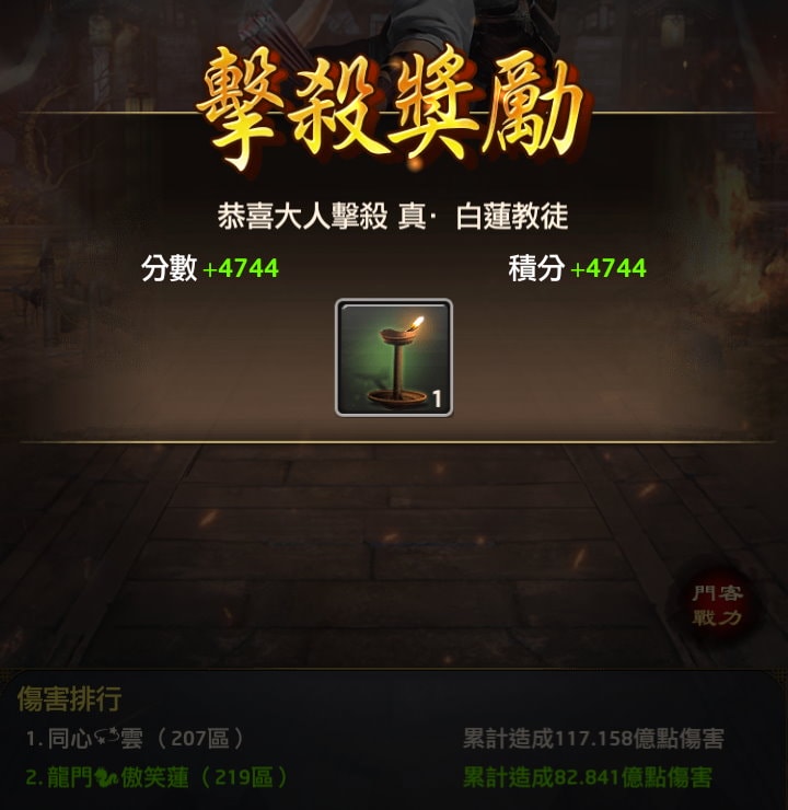 像該門客造成 14.87 億的傷害,戰鬥積分為 744,加上「真.白蓮教徒」的擊殺積分是 4,000,加總就是4,744分。