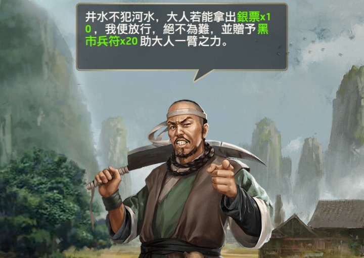 | 山匪阻路 | 銀票x10 | 黑市兵符x20 |