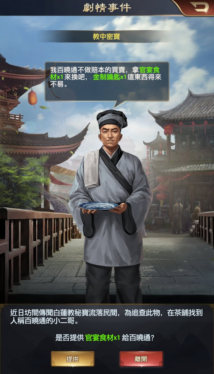 | 教中密寶 | 官宴食材x1 | 金制鑰匙x1 |