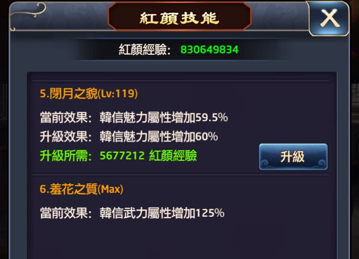 但若集中給1位紅顏,把紅顏魅力點到1萬8(初始魅力就不計算了),傳喚1次加 3,258,000 紅顏經驗,要點滿「第3~6個技能」其中1項,需要傳喚 1,425 次。