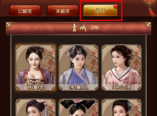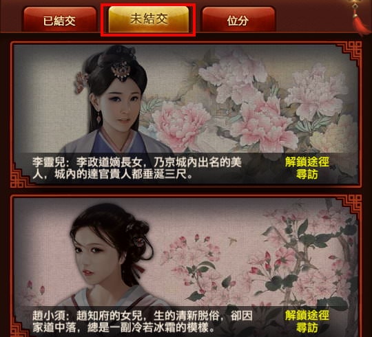 「未結交」這邊能看到你還有哪些紅顏尚未取得、如何取得。