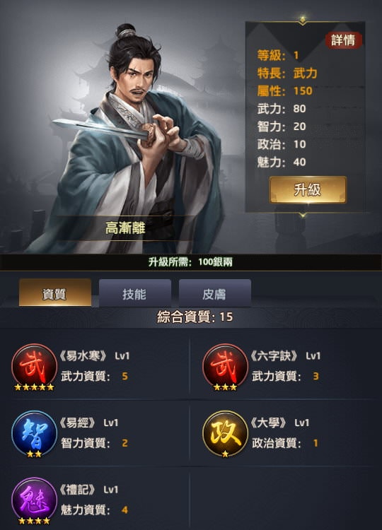 也就是說雖然歐陽修是政治專長,但要把他當武力、智力、魅力門客來練也沒差,問題在於「書籍」好不好升級而已。像我就曾經反過來把歐陽修當武力門客練(武力是他資質最低的項目),1星技能在「不給資源」的狀況下較好練。