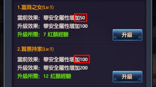 | 紅顏技能:加成項目 |