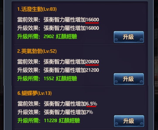 上圖為我旗下門客張衡的屬性與紅顏技能加成,來看智力項目:
