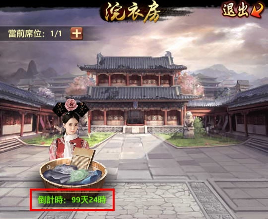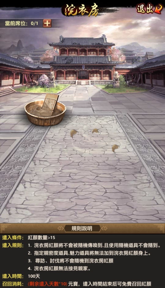 當你要送第二位紅顏(至少已有17位紅顏)到浣衣房前,就得先擴建位置。浣衣房的概念有點類似「學院」,你有幾個位置,就可以送多少人去坐,若要增加位置就得花元寶擴建,而且擴建費用很貴。