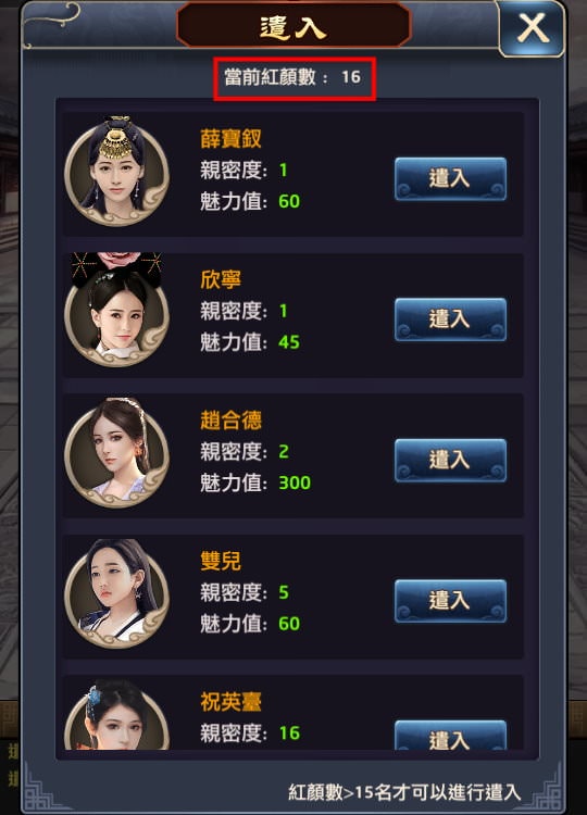 不過浣衣房有個很麻煩的限制,紅顏至少會保有「15位」,第「16位」開始才可以送浣衣房,所以無法說只練8位門客,只想留8位紅顏。至少得保留15位,除非一開始就不要拿那麼多位。