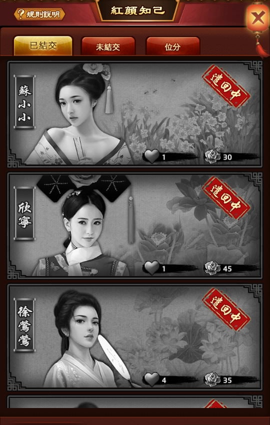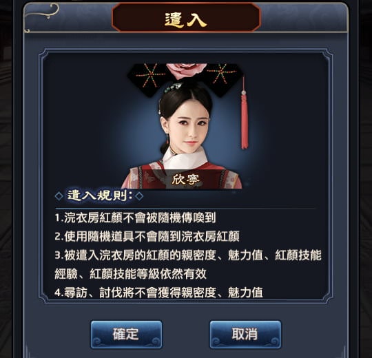 其中第1、第2、第4點,也是為什麼我們要把紅顏送去浣衣房,這樣才能確保隨機道具、討伐時增加親密度與魅力值,是加在那些「對應到我們有在練的門客」的紅顏身上,且傳喚時也不會傳喚到那些已流放的紅顏。