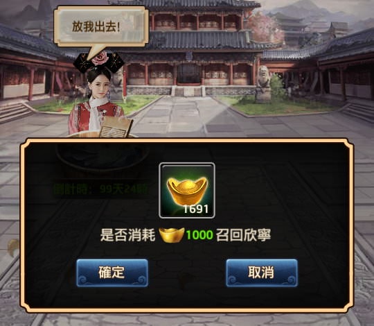 不管是流放紅顏或是門客,一次就是100天,如果你要提早召回,就得花費「剩餘天數 x 10元寶」的費用,假設剩80天,就需要花 80 x 10 = 800 元寶來召回。