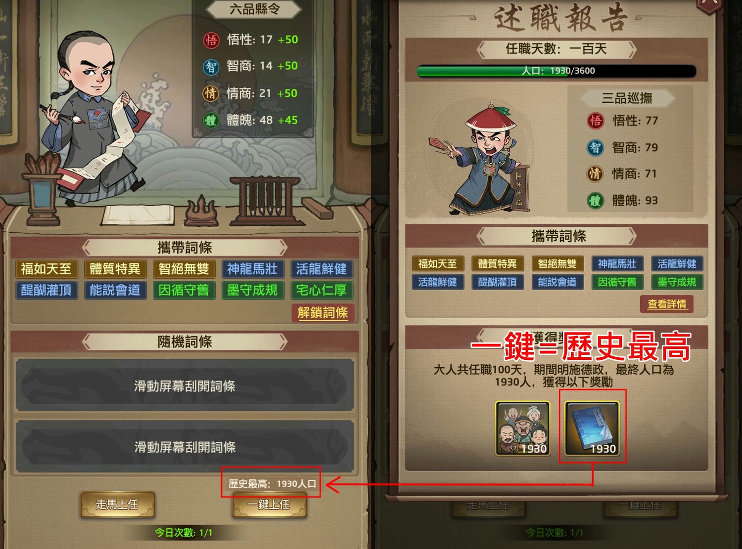 點「一鍵上任」的結果是固定的,看你「歷史最高」的人口數是多少,一鍵的結果就是多少。我甚至有在「多解鎖幾個新的攜帶詞條後再去點一鍵」,結果數值仍然是歷史最高,試驗了幾個號都是這樣。