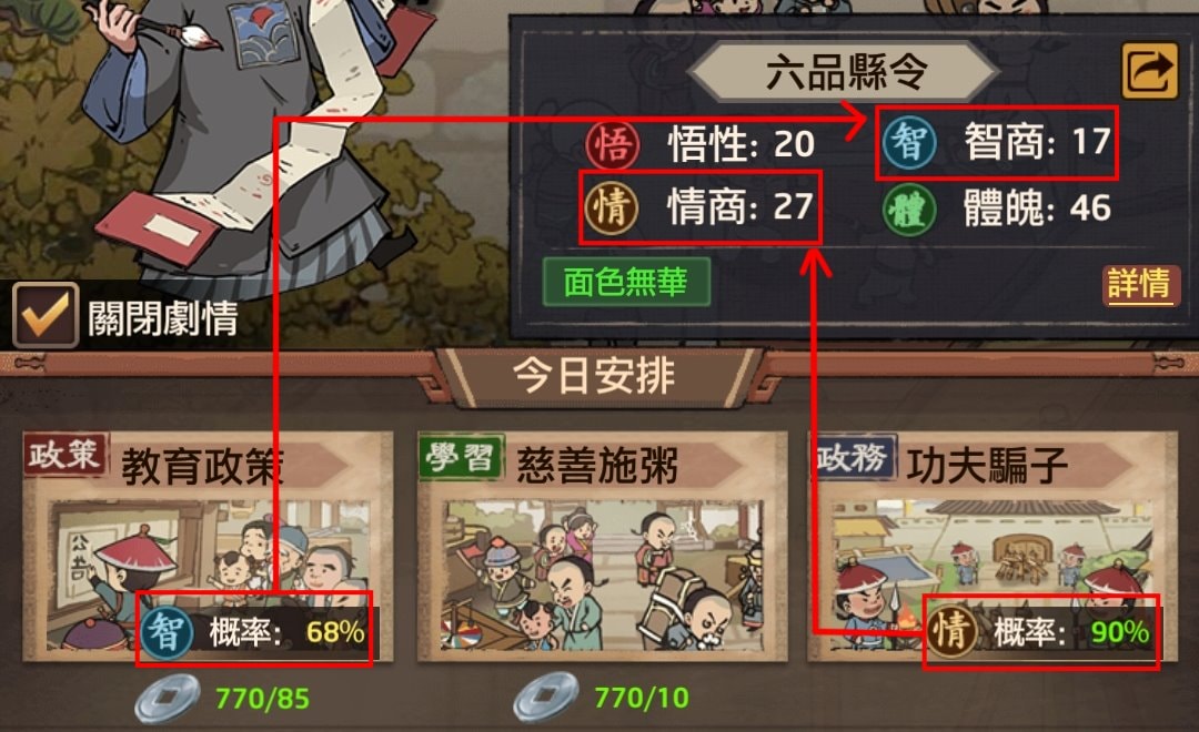 若遇到某項屬性特別高(我有遇過體魄100其他0的狀況),也可以把目標放在對應的政策(如體魄是基建政策)與政務(如體魄是賣身救父),學習時也可針對這項屬性去加強。