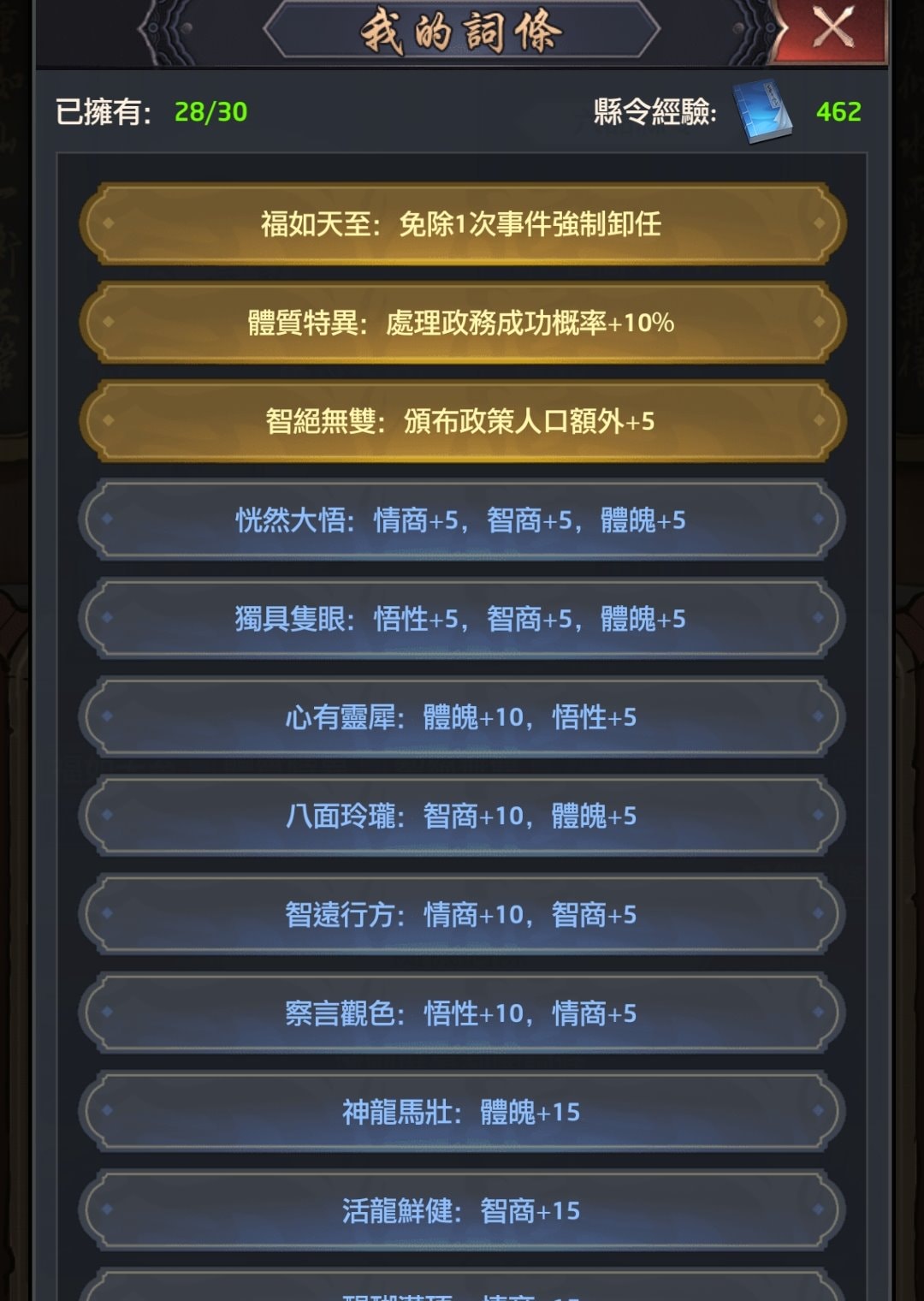 - 其次解鎖「藍色」詞條,藍色系列都是屬性加15,要花2,500縣令經驗,平均167經驗加1屬性,所以順位次於綠色。