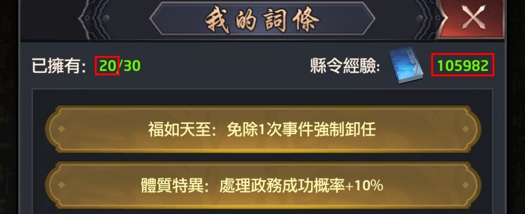 | 中期 | 若比較積極的,可以每天都挑戰能不能衝出更高的分數,但如果某天運氣特別好,衝出特別高的人口數,可以連續數天利用一鍵多存些縣令經驗來解鎖新詞條。想比較輕鬆玩的,等解鎖數個新詞條再手動挑戰衝一次新高人口數即可。 |