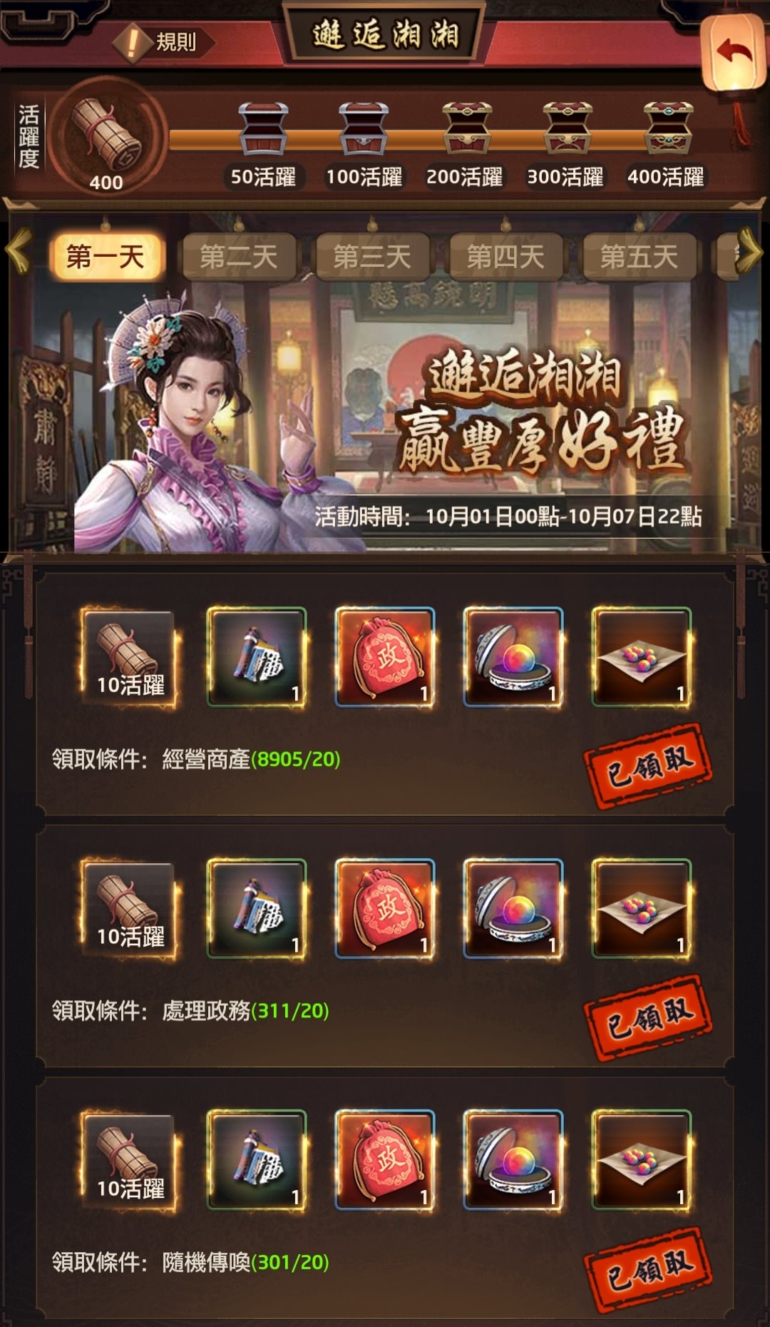 活躍任務中,除非是特殊玩法[附註1],否則要達成400活躍很容易,共可拿到: